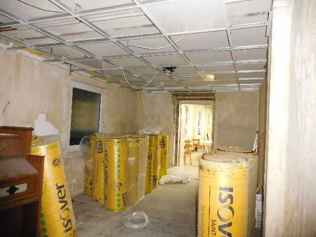 In den Toiletten wurden tlw. Wände und Teile der Decken herausgerissen. Aller Bauschutt wurde per Container entfernt. Am 23. November wurden fünf neue Heizöfen im Saal installiert und in Betrieb genommen, der Raum konnte erstmals wieder auf 20° C erwärmt werden. Aktuell stehen weitere Arbeiten im Heizungsbau sowie Trockenbau (Trennwände, Türen, Brandschutz) an. Eigenleistung wird wieder anstehen, wenn die Elektriker weitestgehend fertig sind. Dazu, sowie für Trockenbau und Bodenbeläge, stehen demnächst Vertragsabschlüsse an. (KW 48)